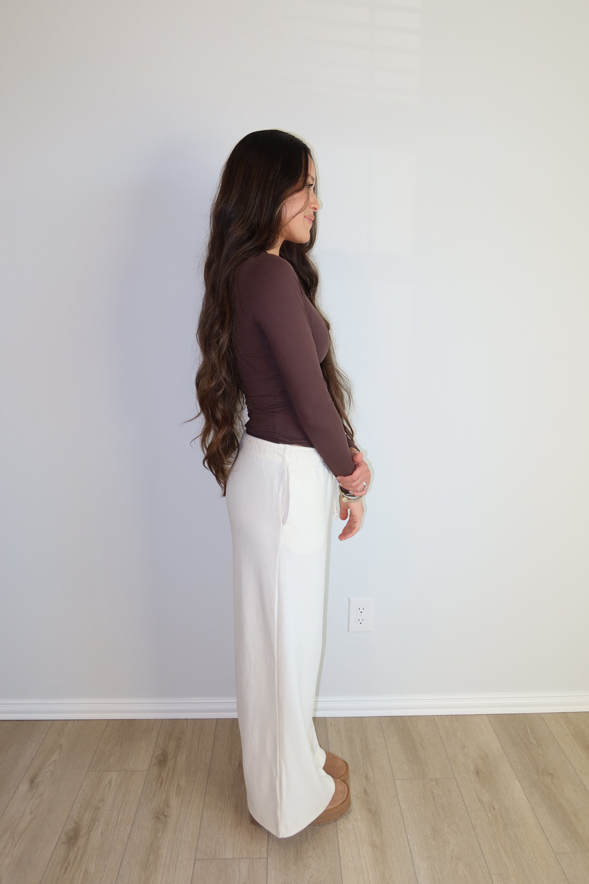 These wide leg lounge pants are a dream! Featuring ribbed soft fabric, pockets, and an advisable waistband. Fits true to size